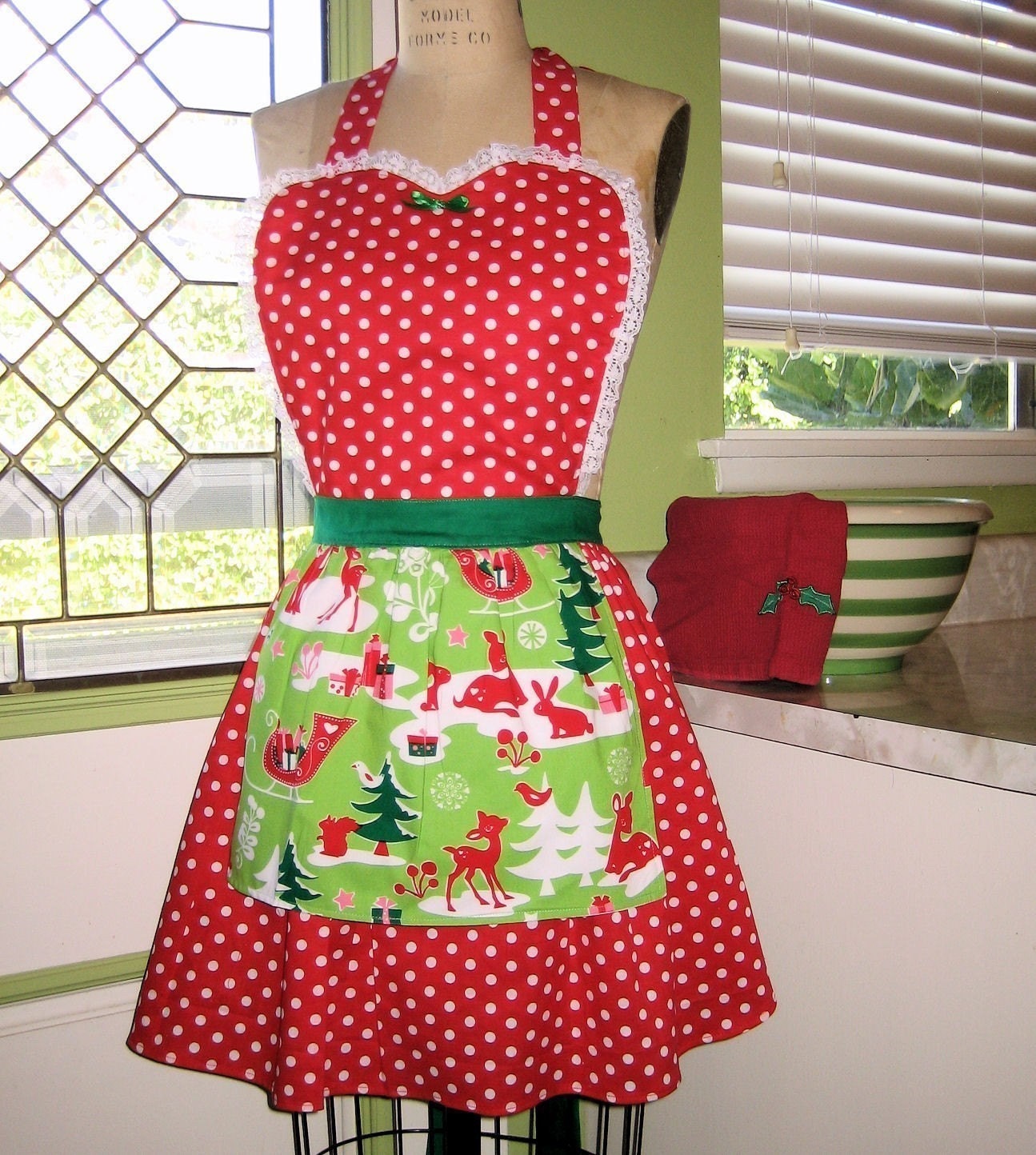 Retro Christmas Apron with DEER print 50s RED polka dots full APRON make a sexy flirty hostess and is vintage inspired | 1,295 | 1,444 | 0.35277 | 5,936,259,027,362,962,000 | 0.008791 | 0.241986 | 7.947702 | A mannequin is dressed in a red and white polka-dotted apron with a festive green and white patterned skirt, displayed indoors with a window and kitchen items in the background. | A mannequin is dressed in a red and white polka-dotted apron with a festive green and white patterned skirt, displayed indoors with a window and kitchen items in the background. | |